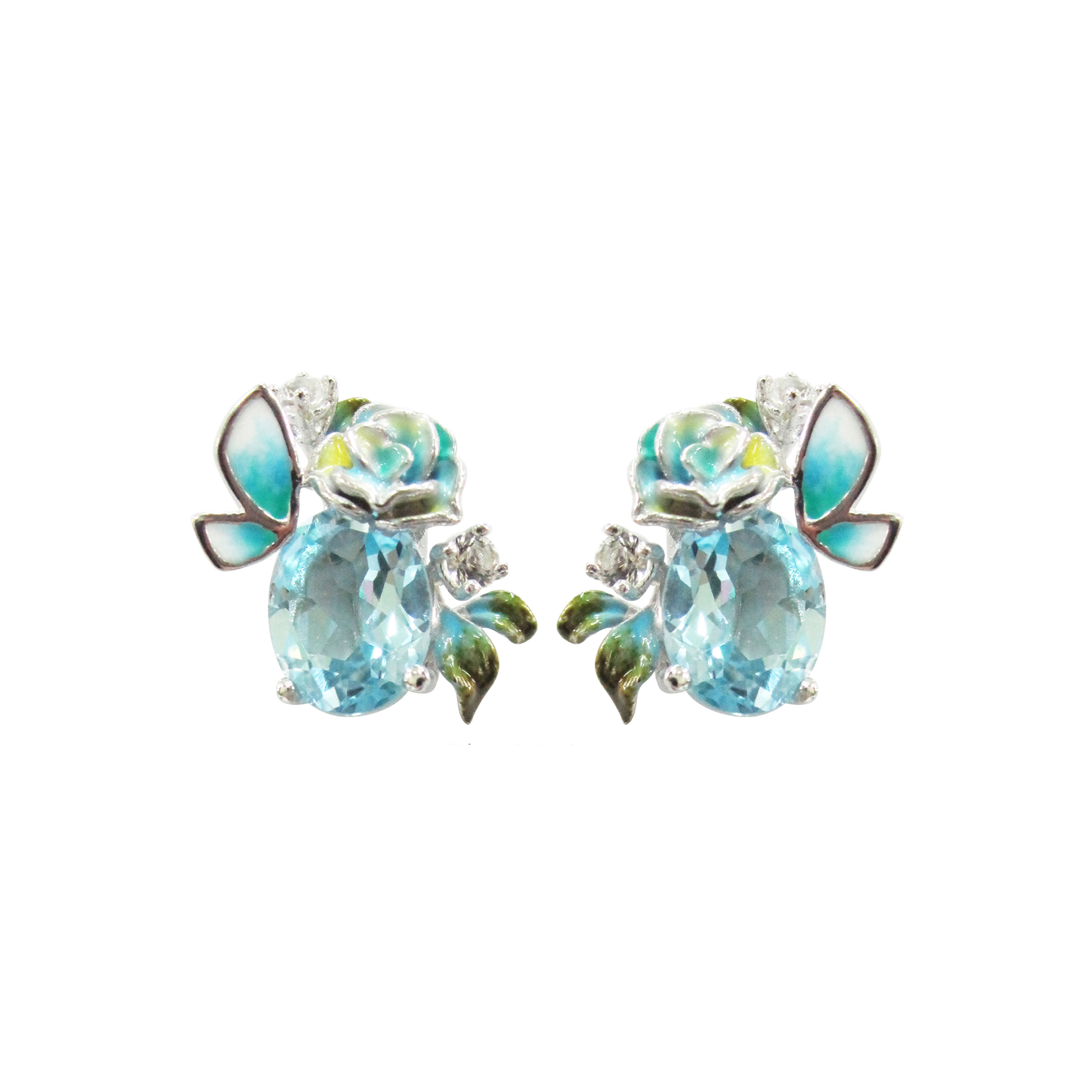 The Vibe & Inspiration: Elegant stud earrings centred on a magnificent oval, faceted Blue Topaz. The vibrant blue stone is framed by intricate floral and butterfly details finished with bright Blue, White, and Green Enamel.