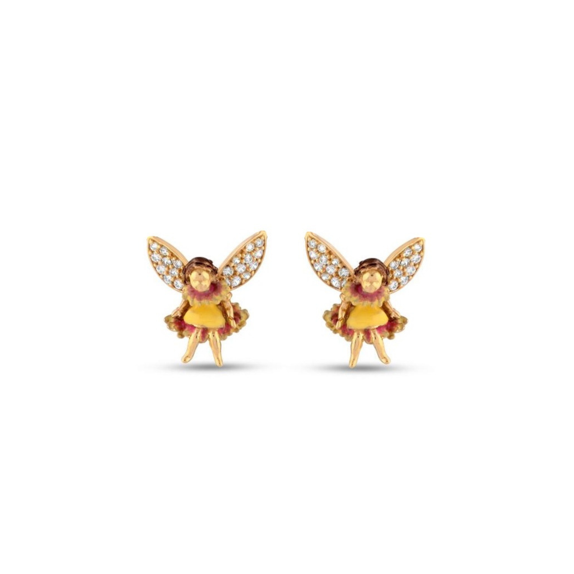 The Vibe & Inspiration: A charming, miniature fairy figure with gold-toned wings paved in sparkling Nano Blue, Green, and Purple CZ, wearing a delightful Yellow and Pink Enamel dress.